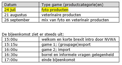Eerder dit jaar heeft de NVWA een bijeenkomst georganiseerd waarin diverse ketenpartners en toezichthouders een import- en export-proces voor groepage vervoer van en naar het Verenigd koninkrijk naspeelden. Deze door de deelnemers zeer gewaardeerde leerzame serious game biedt de NVWA, gezien de naderende Brexit nog enkele malen aan. Op verschillende data worden verschillende typen ketens gesimuleerd. Te weten:
