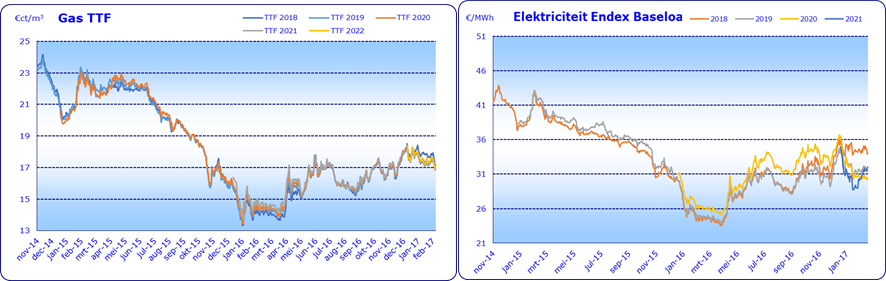 De energieprijzen fluctueren, de ene dag zijn ze hoger, de volgende dag weer lager. De hoogte van de uiteindelijk te betalen prijs voor energie wordt bepaald door het gezamenlijk, collectief, inkopen en door het moment waarop de prijs wordt vastgelegd. Door de recente ontwikkelingen op de energiemarkt, waarbij de prijs weer wat is gedaald ten opzichte van het prijsniveau van januari 2017 en de bijeenkomst die we in maart 2017 hebben gehouden, treft de Energiecommissie van Anthos nu voorbereidingen om op korte termijn een nieuwe inkoopronde op te starten van elektriciteit en van aardgas voor de verlengingsmogelijkheid voor leveringsjaar 2020. De prijsvorming op de energiemarkt is op dit moment ook gunstig om hiermee te starten. Onderstaande grafieken schetsen een beeld van de termijn marktprijzen van gas en elektriciteit.